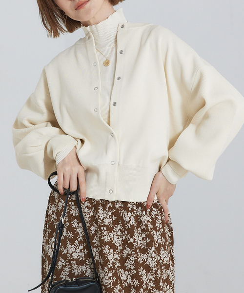 【Design】昨年も好評だった前後着用可能の2WAYのカーディガン。スナップボタンを小さく着丈を短く袖のボリュームを抑えブラッシュアップしました。裾の程よいリブで大人なショート丈に仕上げています。 【Fabric】 ストレッチの効いた程よい肉感のニット。ハリ感がありきれいなフォルムが出ます。 【Styling】 スカートやワイドパンツとの相性が◎。スナップを後ろにして着れば通勤などキレイめコーデにも活躍します。同素材のインナーやスカートもあるので、セットアップコーデもおススメ。