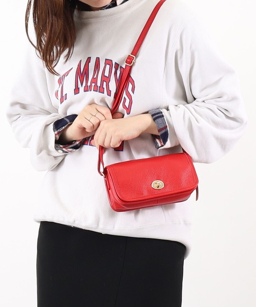大人気牛革シュリンクレザーシリーズ。フラップ×ヒネリ金具がポイントの横型ミニポシェット。傷が目立ちにくいシュリンクレザーを使用。ゴールドのヒネリ金具が上品さを演出します♪スマホもしっかり入るサイズ感で必要最低限なお荷物でお出かけできます。アクセサリー感覚で持てるミニサイズなので着こなしのポイントになります♪■サイズ感:スマホサイズ対応■ポケット:内側2ヶ所 外側1ヶ所 ■開閉:ヒネリ■重量:約230g■サイズ:幅18cm/高さ10.5cm/まち6cm/ショルダ長さ116cm/口開き19cm■素材:表地 牛革 裏地 ポリエステル■原産国:中国製店舗へお問合せの際は下記の商品番号をお伝えください。商品番号:23531-11302※商品の画像はサンプルのため、実際の製品とは、仕様や加工、サイズ等が若干異なる場合がございます。