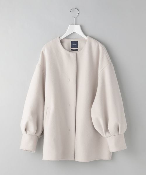A part by(アパートバイ)の軽くて暖かい、冬の定番カシープハイランドウールコレクション。 2023年はウールの糸をきめ細やかにすることで光沢感UPし、更になめらかな手触りに改良しました。 ーーー ノーカラーですっきりとした首回りとぽわん袖が今年らしいブルゾン丈のコート ーーー 【デザインと特徴】 軽くて暖かい!とご好評いただいている A part by(アパートバイ)冬の定番のカシープハイランドウールシリーズ。 きれいめからカジュアルまでスタイリングしやすいブルゾン丈コートです。 後ろ裾に入れたダーツで丸みのあるシルエットと、ヒップ周りをすっぽり隠せる着丈です。 袖口タックで出したぽわんとしたボリューム袖が今年らしく着るだけで華やかさが出て、 他にはないアイテムなのでデザイナーさんも一押しです。 首元は、ノーカラーですっきりと着られるので、普段マフラーを使用する方にもおすすめです。 フロントもすっきりしたブラインドホックあきでクリーンがシンプルさも◎ また、袖部分にだけ裏地をつけたので滑りが良く、さっと羽織れるのも嬉しいポイント 【素材特徴】 2023年のカシープコレクションはウールの糸の番手を細くして、質を上げることでより軽さが出て、 且つ光沢感となめらかさがUPしました。 ■CASHEEP HIGHLAND WOOL この生地は、モンゴル地方の極寒地で育った柔らかいウール糸と、オーストラリアの温暖地で育ったふくらみのあるウール糸をブレンドし織り上げています。 滑らかで光沢のあるカシープの特性に暖さと軽さが加わった素材です。 【洗濯可否】 ドライクリーニングをおすすめします。 【スタイリング】 スカートもパンツにも合わせやすい着丈とオンオフどちらでも着ていただけるデザインです。 キレイめに着たい方はボリュームスカートや色を合わせるのが、カジュアルに着たい方は デニムやストレートパンツで◎