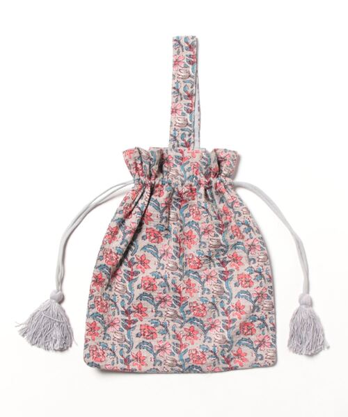 ブロックプリント風の植物や花柄を、スクリーンプリントで表現した巾着型ポーチバッグ。普段使いはもちろん、旅先などでも活躍するアイテム。スーツケースの中でもかさばりにくい形なので、服やインナーのまとめ収納にも◎スリット糸(ラメ糸)入りの生地もポイントです。※こちらの商品は1点1点職人による手作りとなります。その為、生地の取り方により柄の配置や形・色合いなど若干個体差がございます。あらかじめご了承ください。Amina Collection Co.,LTD.