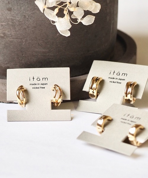 ほどよく、品良く、さりげなく。シンプルで上質な ‘Made in Japan’ のアクセサリー。2つのゆらぎが身を寄せるような、温かみのあるデザインイヤリング。耳元に動きのあるデザインをプラスすることで、シンプルながらも上品に着飾れるファッションアイテムです。バネの力で耳たぶを挟むタイプのノンホールピアス。痛くなりにくい仕様でピアス感覚で楽しめるアイテムです。イヤーカフとしてもお使いいただけます。※バネ部分の開く幅は、デザインによって異なります。耳横側の軟骨部分に挟み、耳たぶの方へスライドするとスムーズにご着用いただけます。ノンホールピアスとは? ノンホールピアスとイヤリングの違いとは? ノンホールピアスとは、その名の通りピアスの穴を開けていなくてもつけられるアクセサリーのことです。イヤリングと同様に耳たぶを金具で挟んだり、樹脂素材で挟むことで耳に装着します。一見ピアスのような華奢な見た目からピアス風イヤリングとも呼ばれており、職場や学校の決まりなどでピアスホールを開けられない人にも人気なんです。長時間つけても痛くなりにくいネジバネタイプの金具やクリップ式のイヤリングは耳たぶをしっかりと固定するのに対して、ノンホールピアスの多くは、金属製または樹脂製のクリップのような金具で耳たぶを挟んでつけるだけ。そのため、イヤリングに比べてとても軽く、長時間つけても耳が痛くなりにくいのがノンホールピアスの魅力の一つです。華奢なデザインを楽しめるネジバネタイプの金具やクリップ式のイヤリングに比べて、耳たぶに挟んでつけることができるノンホールピアスは一粒デザインやチェーンなど小さなモチーフを楽しむことができます。金具部分が目立ちにくく、まるでピアスのようなデザインをつけられるのがノンホールピアスの人気の理由です。金属アレルギーの人でも安心してつけられる樹脂タイプのノンホールピアスは、耳たぶに固定する部分が樹脂でできているため、金属アレルギーの人でも安心してつけることができます。また、デザインによっては裏表を変えてリバーシブルで使えるというメリットも◎ニッケルフリーアクセサリーとは主に金属製のアクセサリーに含まれるニッケルで引き起こるアレルギーを防ぐことを目的に、ニッケルをほぼ含まずに光沢感、耐食性を併せ持つニッケルフリーメッキを使用しています。 ※ご注意ください※すべての方に金属アレルギー反応が出来ないこと(アレルギーフリー)を保証するものではございません。皮膚に異常を感じた場合は直ちにご使用を中止し、専門医にご相談ください。【itam】アイタム「無限の魅力を秘めた知的で天真爛漫な女性をターゲットにシンプルで上質な“MADE IN JAPAN”のアクセサリーを提案します。日常のあらゆるシーンに寄り添う、ほどよく、品よく、さりげなく時代を超えて愛される“ベーシックアイテム”を中心に表情豊かな“シーズンアイテム”をプラスしたタイムレスでエイジレスな“NEXT BASIC”」を提案。 アクセサリー業界では、日本製の定義が曖昧ではございますが、弊社は、全商品、原型製作から鋳造、メッキ、組み立て、検品まで、一貫して国内生産です。見栄えが華奢で繊細なジュエリーライクに感じられる商品作りを心がけています。 また上記でありながら、機能性部分(金属アレルギー対策)も合わせて商品に落とし込めるように企画・製作しております。