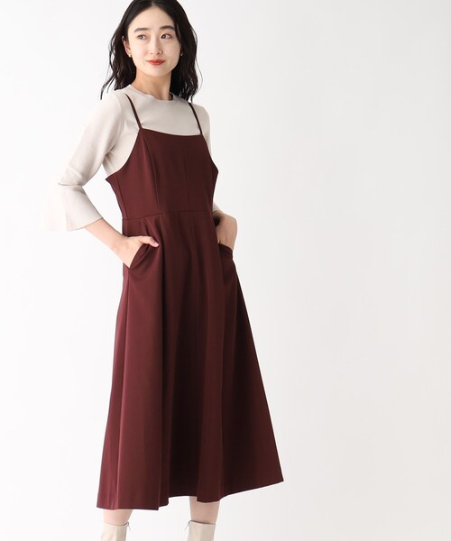切り替えデザインできれいなシルエットのフィット&フレアキャミワンピース【デザイン】・フロント・パネル切り替えデザインを施したフィット&フレアのキャミワンピース。・高めのウエスト位置で切り替え、スタイルUP見えも可能。・裾にかけてはきれいなフレアシルエットも魅力です。・肩紐はアジャスター付きで長さの調節が可能です。・インナー次第で、オールシーズン着回し可能なアイテムです。※後ろファスナー付き※前ポケット×2【素材】・少し表面感のあるある、きれいなツイルポリエステル素材を使用。・マシンウオッシャブルでご自宅でのお洗濯も可能。・シワになりにくくお手入れも簡単。※身頃部分のみ裏地あり、スカート部分は裏地なしこちらの商品は主に秋に着用いただける商品です。モデル情報:身長168cm B76 W58 H86 着用サイズ:38(M)店舗へのお問い合わせ商品番号:637-57308●製品寸法:38(M):総丈100~120cm 着丈104cm B84cm W78cm H94cm40(L):総丈112~122cm 着丈105cm B86cm W81cm H99cm42(LL):総丈115~125cm 着丈106cm B88cm W84cm H104cm備考: