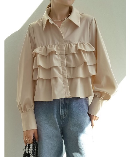 [2023A/W COLLECTION]フリルデザインが旬のフェミニンムードを引き立てるクロップドシャツに新色「ベージュ」が登場!フロントに4段のフリルデザインを施したクロップド丈のシャツが登場。マニッシュな雰囲気な印象のシャツを、旬のフェミニンムードに仕立てた1枚です。短めの丈感とボリューム感のある袖が絶妙な好バランス。フリルが目立つよう、ボタンが隠れる比翼仕立てに。あえてカジュアルなデニムと合わせるのもおすすめの着こなしです。前から見た印象はもちろん、どこから見ても立体感のあるシルエットが楽しめる、デザインシャツです。素材・着用感落ち感のあるレーヨン混のシャツ生地▼お取り扱いについて※この製品は摩擦(特に湿った状態での摩擦)や、汗や雨などで濡れた際に、他の衣類や下着(特に白)等に色移りする場合がありますので十分にご注意ください。※色移りした場合は、速やかに洗濯またはクリーニングに出してください。※洗濯やクリーニングの際、多少色落ちする事がありますので、単品洗い、単品クリーニングしてください。洗剤の量が多いと色落ち度合いが高くなりますのでご注意ください。※速やかに脱水、乾燥をしていただけますようお願いいたします。■モデル着用写真は撮影環境により、多少実際のカラーと異なる場合がございます。お気に入りショップにご登録いただきますと、ショップニュースを、いち早くお届けいたします。