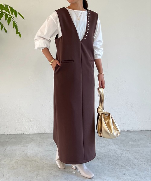 ストレッチ性のある素材で着やすく大人っぽい印象に商品ポイント・パール使いがポイントのジャンスカワンピース・前後2WAYで着用可能で、Uネック・Vネックどちらを前にしてもOK・インに着るものや気分に合わせてコーディネートしやすい◎・ストレッチが入った素材で動きやすく、落ち感もあるので、綺麗なイメージにおすすめコーディネートブラウスを合わせるとちょっとかっちりしたイメージにもなるので、入卒シーンなどにもオススメカジュアルに着たい時はニットやシアーインナーを合わせて足元はフラットシューズ、スニーカーでも◎上からジャケットを羽織ってチラっとパールを見せることでよりきちんと感がアップ素材ポリエステル84%、レーヨン8%、ポリウレタン8%洗濯方法:手洗い可透け感:なし裏地:あり伸縮性:あり生地の厚さ:普通光沢:なしポケット:あり【スタッフ着用コメント】《RINO》身長:148cm/着用サイズ:F体型:普通/骨格:ストレート/パーソナルカラー :ブルベ冬丈感が心配だったので厚底シューズがあると安心♡パールの効果で上品な雰囲気になります《YUI》身長:149cm/着用サイズ:F体型:ぽっちゃり/骨格:ウェーブ/パーソナルカラー :イエベ春149cmの私でFサイズでマキシ丈くらいで着れました。シルエットもIラインですっきり見えました。《ゆうき》身長:152cm/着用サイズ:L体型:ぽっちゃり/骨格:ストレート/パーソナルカラー :イエベ春ぽっちゃりの私でも着れるデザイン!ニットも着れるゆったりさがうれしい!骨格タイプストレート:全体的に立体型で筋肉質。ひざ下はすらっと細め。ボディラインにメリハリがある。ウェーブ:上半身が薄く、華奢。緩やかな曲線のボディライン。下半身に重心があり女性らしい体型。ナチュラル:筋肉や脂肪があまり感じられない体型。腰の位置が高く骨や関節が目立ちやすい。============================【注意点】※画像の商品は光の照射や角度、お使いのモニター環境により、 実物と色味が異なる場合がございます。 あらかじめご了承下さいませ。============================【お買い物をもっと便利に楽しく♪】『♡』をクリックでお気に入り登録・「商品のお気に入り登録」で・・・ラスト1点や再入荷の通知が届きます。登録して頂いた商品だけが対象となる、あなただけのタイムセールが開催されることも!・「ブランドのお気に入り登録」で・・・新商品や再入荷など、いち早くブランドのお得な情報を受け取ることができますので、ご登録をおすすめします! ============================