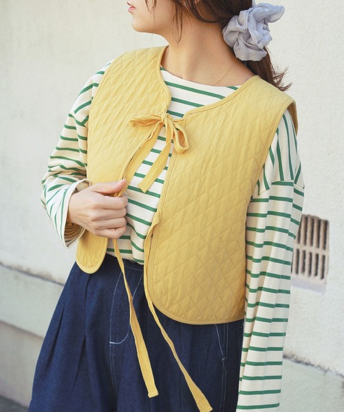 シーズンムード漂うキルティングベスト。フロントのリボンが可愛らしく、女性らしさを演出します。薄手のコットン生地を使用しているので、重ね着しても着ぶくれ感がないのも着やすいポイントです。ショート丈でバランスが取りやすくスタイルアップ効果も◎コンパクトなシルエットで他のアイテムと合わせやすく、ブラウスやワンピース等、様々なアイテムとのレイヤードスタイルが楽しめる1枚。合わせるだけでコーディネートをワンランクアップしてくれます。程よくゆとりのあるアームホールでボリューム袖のアイテムとも相性良く着ていただけます。リボンを結んだ着こなしはもちろん、敢えて結ばずに着るのもこなれ感がありおすすめです。肌触り柔らかなコットン素材。薄手ながらも暖かみのある1枚です。- - - - - - - - - - - - - - - - - - - - - - - - - - - - - - - - -透け感:なし裏地:あり伸縮性:なし光沢感:なし- - - - - - - - - - - - - - - - - - - - - - - - - - - - - - - - -※ 撮影時の照明などの環境と、モニターに表示される色味がメーカーにより変わってしまう等の理由により、実際にお届けする商品と、ご覧になられているアイテムの色が若干異なる場合がございます。ご了承下さいませ。