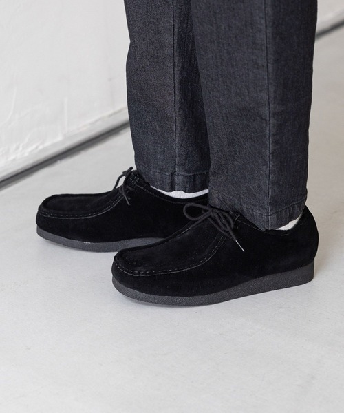 丸みのあるフォルムが特徴の一足。 スエード調の素材で柔らかい雰囲気があり秋冬のスタイルに馴染みます。 やや高さのある作りなのでスリム、テーパード、裾を絞れるパンツとの相性が良いです。 そのほかのパンツでもロールアップするとバランスよくまとまります。