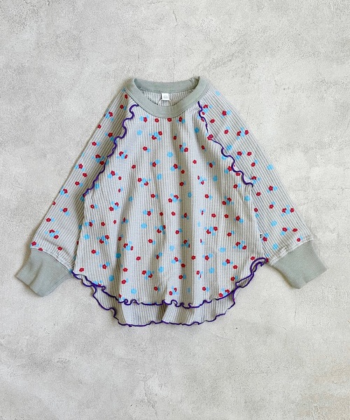 【HOGAN RANCH WEAR】コーデのアクセントになるフラワー柄カットソー♪柔らかい肌ざわりのワッフル素材。伸縮性もあるので、身体にフィットして着心地◎可愛い小花柄に、メローのカラー配色が目を引きます。裾はラウンドカットでメローが施されていてとってもカワイイ。お出かけはもちろん!おうち時間でも重宝しそうな万能アイテムです☆■セットアップコーデも可能です。フラワーワッフルメローレギンス:0010132036■親子でリンクコーデもオススメです!大人サイズ:0010332037■モデル着用アイテムCOTTON from U.S.Aビックポケットデニムオーバーオール:0110232001