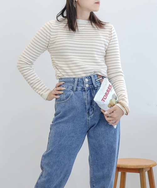 シンプルで着やすいハイネックボーダーのニットトップスです。 ハイネックなので温かく、袖口は締め付け感がなく着やすいです。 やわらかい色合いのボーダーで、ラインが細みなので大人っぽく、パンツやスカートなどカジュアルなスタイルにもキレイ目なスタイルにも合うので1枚あるとコーディネートに迷いません!