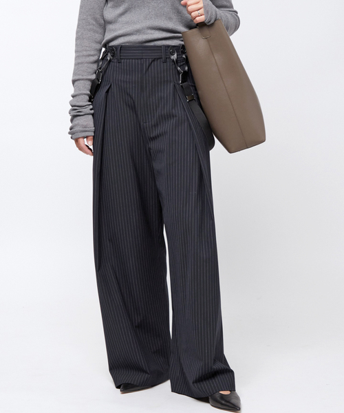 【2023AW】 ワイドシルエットとPROVOKEのストライプパンツ。 タック入りのデザインで腰回りはすっきりとしているので余裕のあるサイズ感ながら上品なシルエットを演出します。 カッチリとしたストライプ柄が印象的なネイビーとニュアンスのあるチャコールグレーの2色展開。 サスペンダー付きの仕様なので、あえて肩にかけずゆるっと穿いたリラックススタイルや、ジャストサイズで合わせてワイドシルエットをキレイに見せるモダンなスタイルなど、色々なコーディネートを楽しんでいただけます。 【PROVOKE/プロヴォーク】 provoke=""挑発する"" ""引き起こす"" ""刺激する"" 服は着る人がどう着るか決めればいいという理念のもと、ジェンダーレス、タイムレス、エイジレス、色々な垣根や決めつけを無くし、自由な発想でスタイリングを提案します。 ※色によって素材が異なります。 【ネイビー】ポリエステル48%、レーヨン47%、ポリウレタン5% 【グレー】ポリエステル65%、レーヨン31%、ポリウレタン4% ※取り扱いについては、商品についている取扱表示にてご確認下さい。 ※照明の関係により、実際よりも色味が違って見える場合があります。 またパソコン・スマートフォンなどの環境により、若干製品と画像のカラーが異なる場合もございます。 ※商品の色味は、商品アップ画像をご参照ください。 ※メーカー型番:PV-050040 ※カラーについて 弊社販売カラー名:メーカーカラー名 グレーB(008):C/# CCG ネイビー(040):#900 ※サイズについて 弊社販売サイズ名:メーカーサイズ名 36(036):ベッチュウ 38(038):ベッチュウ モデルサイズ:H162 着用サイズ:グレー36/ネイビー38 本体:ドライクリーニング