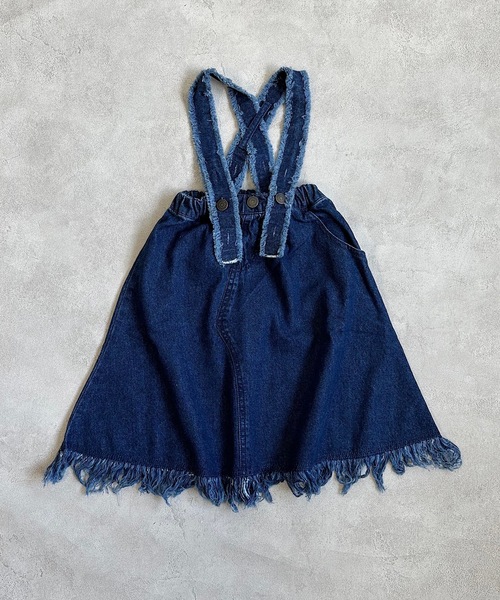 【BIG FIELD】ふんわり広がるフリンジデニムスカート♪裾とサスペンダーのフリンジがポイント☆裾にかけて広がったフレアシルエットがカワイイ!サスペンダーは取り外し可能で、コーデに合わせて楽しめマス。また、ボタンで3段階の長さ調整もできます。ふくらはぎの中心位の丈感。どんなトップスでも合わせやすいので1着あるとコーデの幅が広がります。◆左側1か所とバック2か所にポケット付き■親子でリンクコーデもオススメです。大人サイズ:0000832010■モデル着用アイテムミッキーマウスラグランロンT:0000332013