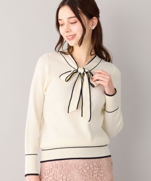 なじみのある配色が大人可愛い、ボウタイデザインニット。ずっと触れていたくなるもっちりとした素材感で、着心地抜群です♪●Detail/特徴バイカラーのボウタイリボンが大人可愛いリボン・袖口・裾の配色でシンプルになりすぎず、着映えます。袖&裾がやさしくフィットするので、ゆとりをもたせて女性らしく着こなせます♪ゆったりしすぎない絶妙なシルエットで、ウエストインコーデもすっきりキマります。●Fabric/素材ずっと触っていたくなる♪肌に優しい、もっちりニット。さらりとした編地で、きれいスタイルに♪伸縮性もあり、快適な着心地を叶えます。………………………………………透け感:なし厚さ:普通伸縮性:あり裏地:なしポケット:なし………………………………………●MODEL:メーガン花子 身長167cm Mサイズ着用ティファニー 春香 身長163cm Mサイズ着用※ご覧のモニター環境により画像の色味と多少異なる場合がございます。※撮影照明の関係により実際の色味と異なって見える場合がございます。予め、ご了承ください。● ボウタイ取り外し不可洗濯:手押し洗い ---------------------------------------------------------------------【お買物をよりお楽しみいただく為に】▼商品のお気に入り登録をおすすめします♪『♥をクリック!』完売カラーの再入荷やラスト1点の追加、セールの際の通知を受ける事ができます。ブランドのお気に入り登録もご一緒にお願い致します。---------------------------------------------------------------------