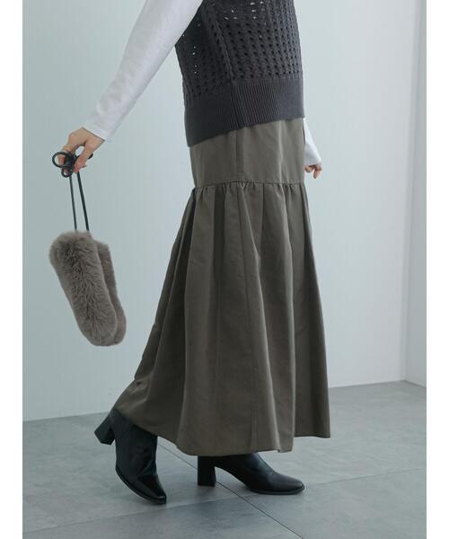ふんわりとしたティアード切り替えが立体的なシルエットを演出するロングスカート。生地にはほんのりと光沢感があり、さらりとした着こなしを楽しめます。ウエストにあしらわれたドローストリングでサイズ調整できるのもポイント◎トップスをタックインしたメリハリのあるコーディネートがおすすめです。※商品画像は、撮影環境やお客様のご利用のPC・スマートフォンのモニター環境などにより実物と色味に差異がある場合がございます。【その他採寸】F ウエスト:[ゴム仕様]66cm