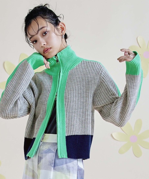 ・ショート丈でコンパクトなサイズ感のニットカーディガン。・配色使いがおしゃれな1枚。・ダブルジップでスタイリングの変化を楽しめます。※当商品は機械による生産の過程上、どうしても"生地を織る際の糸の継ぎ目"や多少の"ほつれ"、他繊維の"混紡"、また、形やサイズや柄に多少の"誤差"が生じる場合がございます。※サイズは、実寸サイズを測っているため多少誤差がでる場合があります。製造工程の関係上、各採寸箇所実寸(平置き)より【約-3cm~+3cm】程度は誤差の許容範囲とさせて頂いておりますので、予めご了承くださいませ。※メーカーより密封状態で入庫し、検品時に再度袋詰めを行っておりますが、素材により染料等の臭いが強い場合がございます。※発送上の状態によって商品がシワになる場合がございます。※商品により色落ち・色移りがある場合がございますので、品質表示をご確認の上、お取り扱いにご注意くださいませ。【伸縮性】あり【透け感】淡色に多少あり