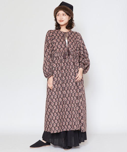 ブロックプリント風の草花模様、ボタニカル柄をスクリーンプリントで表現したワンピース。 シンプルな形で着やすいデザイン。 ボリューム袖や胸元のリボンもポイント。 肌ざわりの良いインド綿とゆったりとしたシルエットで、リラックス感のある着心地です。 ・袖口ゴム入り。 ・両サイドポケット付き。 ※こちらの商品は1点1点職人による手作りとなります。その為、生地の取り方により柄の配置や形・色合いなど若干異なる場合がございます。あらかじめご了承ください。※屋外での撮影画像は、光の当たり具合で色味・カラーが違って見える場合がございます。商品のカラーは、スタジオ撮影の画像をご参照ください。 Amina Collection Co.,LTD.