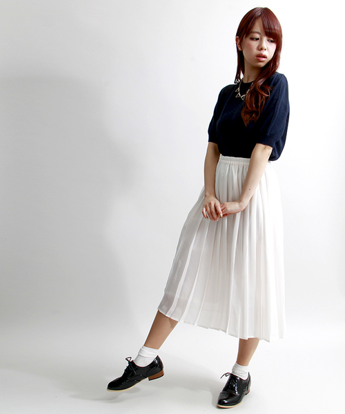 ミドル丈で仕上げたプリーツスカート。綺麗な落ち感と広がり過ぎない絶妙なシルエットが程よく上品な仕上がり。ウエストはゴム仕様になっており、リラックスして快適に着用頂けます。ショート丈トップスと合わせたフェミニンな着こなしは勿論、ヘアバンドやスニーカーと合わせるような、MIX感ある着こなしも今季オススメです。