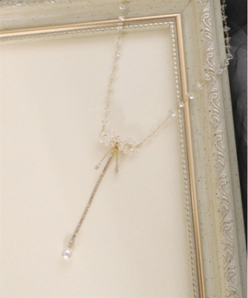 【アイテム説明】 クリアビーズのチェーンに小さめのリボンがあしらわれた華奢なネックレスです。控え目ながら、しっかりとした存在感があります。