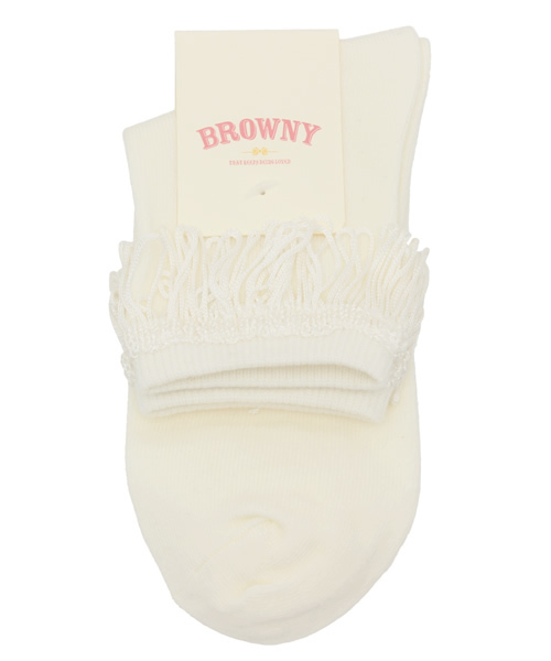 履き口にフリンジをあしらったソックス。柔らかく脚のラインにフィットし、ストレスなく着用して頂けます。クウォーター丈の程よい長さのソックスはパンプスやフラットシューズと合わせたり、ロ-ルアップしてチラリと覗かせる様な着こなしもオススメ。お値段も手頃で、ご自身用は勿論、プレゼントにもオススメです。
