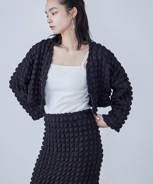 ぽこぽこポップコーンロングタイトスカート(ft0320005717)とのセットアップコーデがおすすめ。 ぽこぽこのポップコーン素材でガーリーな雰囲気たっぷり。 サラリと羽織れるボレロはショート丈でトレンド感も満載。 キャミやタンクに、秋冬はロンTやハイネックニットとの相性も抜群。 短めの着丈だからコーデのバランスも取りやすく、ワンピやロングスカートにも合わせやすい。 シンプルデザインだからこそ生地の可愛さが際立つ、さりげなく洒落るアイテム。 【備考】 ・伸縮性あり ・オフホワイトのみ透け感あり