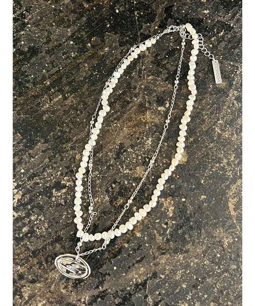オリジナルマークを使用した、ネックレスです。内側のチェーンには淡水パールを使用。ひとつひとつ形が違うニュアンス感がポイント。しっかりとした重厚感があり、ビーズとは異なる高級感とツヤがあります。Eマークはオリジナルのモチーフ。他にはないトレンド感のあるアイテムです