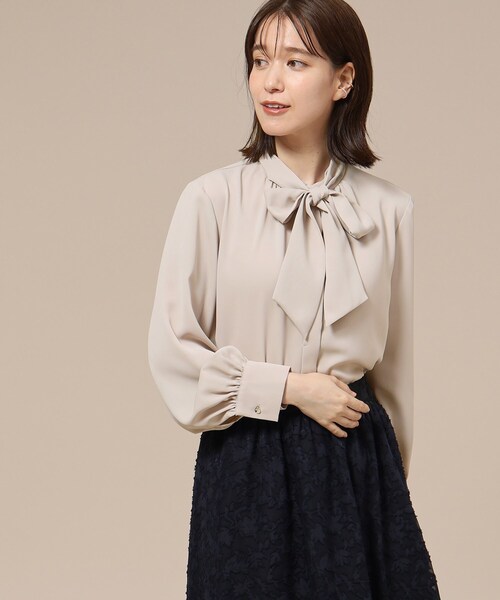 サスティナブル2WAYボウタイブラウス 【デザイン】 ボトムの印象に合わせてキレイめからカジュアルまで、幅広く着回し可能な優秀な1枚。 ふんわりスリーブとボウタイリボンが可愛い長袖ブラウスです。 取外し可能なボウタイ付きで、スタイルに合わせて着ていただけます。 【スタイリング】 タイトスカートやテーパードパンツを合わせれば、オフィススタイルに。 ジャケットやカーディガンのインナーとしてもお勧めです。 休日にはデニムを合わせて、キレイめカジュアルに着こなして。 ボウタイは取り外し可能で、気分やシーンに合わせて首元の印象を変えられます。 【素材】 リサイクルポリエステルを使用した環境にやさしいサスティナブル素材です。 イージーケア機能付き。 柔らかで肌触りの良いブラウス素材。 モデル情報:身長166cm B80 W59 H85 着用サイズ:02(M) 店舗へのお問い合わせ商品番号:741-87008 ●製品寸法: 02(M):着丈57cm B98cm 袖丈59cm 肩幅37cm 03(L):着丈58cm B101cm 袖丈60cm 肩幅38cm 04(LL):着丈59cm B104cm 袖丈61cm 肩幅39cm 備考: