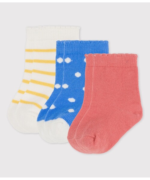 合わせやすいプレーンカラー、人気のドット柄、アイコニックなミニマリニエール柄で揃えたソックス3枚セットです。やわらかな肌触りと優れた伸縮性を兼ね備える、コットンベース素材を使用。快適な履き心地がベビーも大満足。何足あっても困らないアイテムは、ギフトとしてもおすすめです。