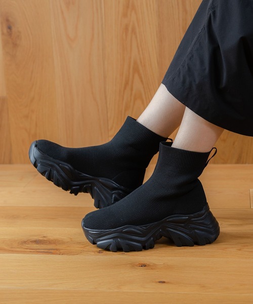 ボリューム感のあるスニーカーソールがポイントのブーツ。伸縮性のある素材を使用し、厚底ソールなので安定感もあり履きやすさも魅力の1点です。カジュアルなスタイルにはよりストリート感をプラスしてくれ、フェミニンスタイルには外しアイテムとして活躍するアイテムです。