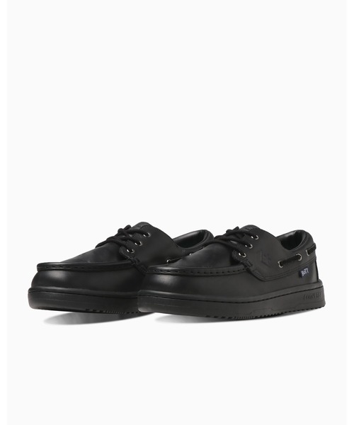 「CONVERSE SKATEBOADING」+シリーズから、デザイナーのTEITO氏が手掛ける東京を拠点にするストリートブランド「BoTT」とのコラボレーション第2弾。 アーカイブのDECKSTAR ELITEをモチーフにスケート仕様へアップデート。ソフトで光沢感のあるブラックのスムースレザーにガンメタルのハトメを合わせ、マットですっきりとした印象に。 シックなブラックの1カラー展開。 革靴のようなブラックの丸紐を採用。柄入りの丸紐がスペアシューレースで付属。 BoTT グラフィックデザイナー、アーティスト、そしてクリエイターとして活躍するTEITOにより、2019年に立ち上げられた、東京を拠点とするストリートウェアブランド。 ブランド名である「BoTT」は、“Birth Of The Teenager”を由来とし、ユース独特のフレッシュなテンションを持ちながらも、肩の力が抜けたほどよいバランスで魅力的なアイテムを展開。 アイテムに施された、ポップでクラシックなブランドロゴをはじめ、エッジの効いたグラフィックも魅力の一つ。