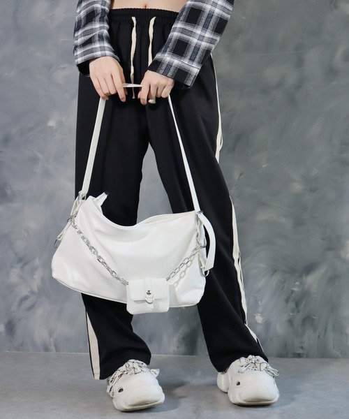 【 BARELY BLUE / ベアリーブルー 】 ミニポーチ付き スクエア ショルダーバッグスクエアのシルエットがY2Kっぽいショルダーバッグ。さり気ないメタルチェーンと、色々な小物を分けて入れられる便利なミニポーチが嬉しいポイント!容量がたくさん入るので、荷物が多い日にも最適です♩ポーチとは別に本体部分にも内側にポケットが付いているので、リップや鍵など、すぐに取り出したい小物も分けて収納できるのが魅力。また、ショルダーストラップはベルトになっているので、自分好みの長さに調節できるのが◎カラーは、いろいろなコーディネートに合わせやすい、ブラック、ホワイト、シルバーの3色展開です!#BARELY BLUE淡いグレーのようなブルーのような、絶妙に馴染んでくれるカラー、BARELY BLUEらしいアイテムをあなたに。トレンドライクなバッグや洋服など、枠にとらわれないUNISEXブランド。※撮影・モニター環境等により実際の商品の色味と異なって見える場合がございます。【インフォメーション】◆商品のお気に入り登録完売カラーの再入荷通知を受け取ることができます。ぜひご登録ください♪◆ブランドのお気に入り登録新商品や再入荷などのお得情報を受け取ることができます。ぜひご登録お願いします