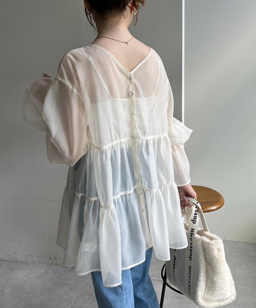 ~NICECLAUP 2023 early autumn Collection~ レイヤードコーデに活躍するティアードチュニック 透け感のあるオーガンジー素材で軽い着心地です。 袖はベルスリーブのデザインで華奢感を演出します。 フロントは羽織や着崩しにも便利な前開きデザイン どちらを前にしてもつかえる2WAY使用なので、コーデに合わせて使用を変えて頂けます。 インナーや、レイヤードするトップスなどで印象がガラリと変わる着回し力もあるアイテムです。 ■オススメスタイリング 暑い時期なら、キャミソールを合わせてメイントップスとして合わせるのが◎ 秋冬シーズンなら、短めのニットを合わせたレイヤードコーデもオススメ。 シアー感ある素材に秋冬の重めな素材の掛け合わせが旬なコーデになりオススメです。 ------------- 裏地:なし 伸縮性:なし 生地の厚さ:薄い 生地の重さ:軽い 洗濯 :手洗い/ドライ ------------- ※サンプルでの撮影のため、実際のものと仕様や色が異なる場合があります。 ※室内、室外での撮影のため実際より明るく映っていたり、暗く映っていたりする場合がございます。 ※品質表示を必ずご確認下さい。 【商品のお気に入り登録】 完売カラーの再入荷や、ラスト1点のお知らせ、セールの通知を受け取ることができます。 【ブランドのお気に入り登録】 新作入荷や再入荷情報など、ブランドの情報をいち早くお届けします。 ぜひご登録ください♪