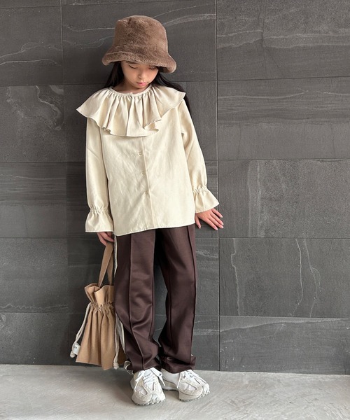 シーズンライクな微起毛素材♪トレンドの襟付きトップスが秋冬仕様で登場!!■デザインボリューム感のあるフリルが魅力のブラウス。トレンドライクな首元はもちろん、ボリュームスリーブが更にふわっと感を演出◎滑らかな起毛感のある生地で、ナチュラルな雰囲気をプラスしてくれます。デイリー使いにはもちろん、特別な日のコーデにもおすすめです。■素材肌触りの良い柔らかな混合素材を使用。秋冬らしい起毛感がありながら、重くない軽やかな着用感。ロングシーズン着回しを楽しめます。・・・・・・・・・・・・・・・・・・・・・・透け感:なし裏地:なし伸縮性:なし光沢感:なし生地の厚さ:普通洗濯のしかた:液温は40℃を限度とし、洗濯機で非常に弱い洗濯ができる。・・・・・・・・・・・・・・・・・・・・・・■スタイリング1枚でサマになるブラウスなので、シンプルなリブスカートやデニムで合わせるのがおすすめです。サロペットやキャミワンピなどのインナーにするとフリルがポイントになってコーデがサマになること間違いなし◎※画像の商品はサンプルです。 実際の商品と仕様、加工、サイズ、素材が若干異なる場合がございます。※サイズXXLはWEB限定です。※サイズ表記は下記ご参考くださいませ。S(100~110)M(110~120)L(120~130)XL(130~140)XXL(140~150)気になった商品はお気に入り登録がオススメです! 入荷情報や、クーポン情報が通知されるようになります。