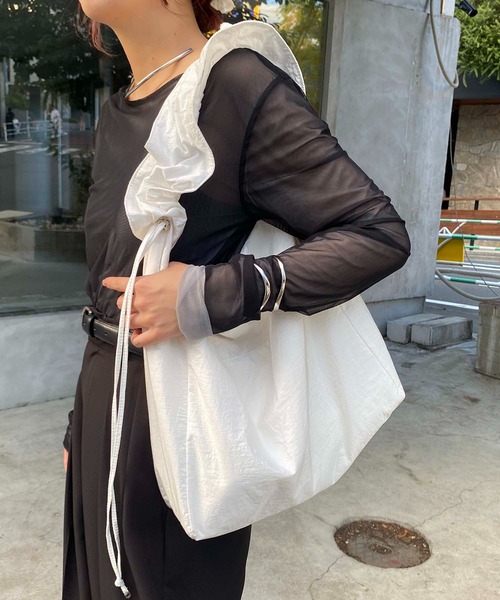 大きめのナイロン混のカジュアルなバッグ 商品ポイント ・ショルダー紐がドロストになっているので、短くするとフリルっぽくなる ・長くして斜め掛けにも◎ ・軽くて大容量なので、旅行などにもおすすめ ※撮影場所やお使いのモニター環境により若干お色味が異なる場合がございます。 特にロケの撮影では明るく見える傾向にございます。 ※商品はサンプルで撮影をしております。若干の仕様が変更になる場合がございますので予めご了承の上ご注文くださいますようお願いいたします。 ▼商品のお気に入り登録 完売カラーの再入荷通知や、ラスト1点の通知、セールの通知も受け取ることができます。 ▼ブランドのお気に入り登録 新商品や再入荷など、いち早くブランドのお得な情報を受け取ることができます。