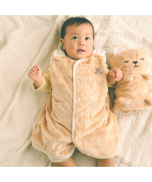 クマとウサギのシルエットが型押しされているポコポコした素材感のボアが印象的なスリーパー。 肩にほどこした立体的な耳がベビーらしい可愛さを引き立てる1着です。 小さなポケットはさりげなくアクセントになっています。 立体的な耳や胸元にほどこした刺しゅうはカラーごとに異なるので2色の中からお気に入りの動物さんを選んでね。 ピンク:ウサギ オレンジがかったベージュ:くま ずっと触っていたい!肌触りのいいボアを使用しているのでベビーもニッコリ。 スリーパーを着ておねんねすれば、動き回ってもお腹が出なくて安心! お布団替わりにもなって便利です◎ 赤ちゃんの快適な睡眠をサポートしてくれる優秀アイテムです。 ※左右ポケットあり ※柄の出方は生地の裁断により一点一点異なります。 ※モデル画像はライトを当てて撮影しているため、実際の商品カラーと差異がございます。 2023年秋冬男の子・女の子アイテム。 【SLAP SLIP(スラップ スリップ)】 ~子どもの欲しいをカタチに~ ヨーロッパのこどものように 子どもらしい今しか着れないナチュラルなかわいさを提案 どこか上品で清楚感漂うフレンチカジュアルは いつものコーディネートをさりげなく格上げ