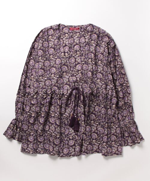 ブロックプリント風の草花模様、ボタニカル柄をスクリーンプリントで表現したカーディガン。袖口の大きなフリルが可愛らしく女性らしさを引き立てます。胸元のタッセル紐もポイント。肌ざわりの良いインド綿で、リラックス感のある着心地です。※こちらの商品は1点1点職人による手作りとなります。その為、生地の取り方により柄の配置や形・色合いなど若干異なる場合がございます。あらかじめご了承ください。Amina Collection Co.,LTD.