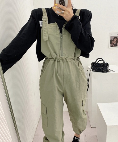 胸元のジッパーがカジュアルでかわいいサロペットです! ウエストは紐で調節可能になっているので履きやすく、カジュアルなシルエットなのでTシャツやスニーカーなどとの相性抜群です! パンツ裾にはゴムが入っているのでブーツなどにも合わせやすく、肩紐で長さの調節もできるのでお好みのスタイルで着ていただけます。
