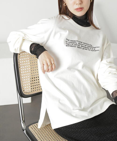 メッセージ性のあるロゴ刺しゅうがキャッチーなロンT。肌触りの良い綿テンジク素材を使い、軽く薄手の風合いで着やすく仕上げました。ゆったりとしたオーバーサイズにドロップショルダーデザインで華奢見えに。1枚で着るだけでなく、チュールアイテムなどとレイヤードするのも今年らしくておすすめ。リラックスパンツやロングスカートと合わせたルーズ感ある着こなしもトレンドライクに決まります。※ロゴの意味「The capacity and sensitivity to empathy cannot be explained by logic or ethics.Because it is a wonderful talent given to humans.」共感する能力や感受性は論理や倫理では説明できない。それは人間に与えられた素晴らしい才能だから。※モデルの着用画像の場合、光の当たり具合により、実際の色味と異なって見えることがございます。色味は、商品単体の画像をご参照ください。