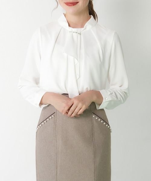 【パールをあしらった女性らしさの詰まった一枚】毎シーズン大人気の金具使いボウタイブラウスがバージョンアップして登場!勘ぐ部分に華奢なパールをあしらったより女性らしいデザインに仕上げました。エレガンスながらも女性らしい甘さをプラスした一枚です。ボウタイフリルデザインがベーシックで知的なイメージを与え、オフィスシーンに大活躍。いつもとは一味違うボウタイブラウスがコーディネートにバリエーションを与えます。トレンドの配色デザインや、優しめな柔らかいカラーで揃え、春先までも長く着用できる万能ブラウスです。【ASTORIA ODIER(アストリア オディール)】大人可愛いスタイルを提案するエレガンスブランドです。オフィス、通勤スタイルを中心に日常を楽しくさせる女性らしいアイテムを展開しています。オンスタイルからお出掛け・デートや女子会といった女性らしく魅せたい大切な日に◎組み合わせるアイテム次第で、きれい目×カジュアルのmixコーディネートも◎◆《お気に入り登録》でお得な情報を◆・「商品のお気に入り登録」再入荷、ラスト1点、セール情報などの通知も受け取ることができます。・「ブランドのお気に入り登録」新商品や再入荷など、ブランドのお得な情報を受け取ることができます。