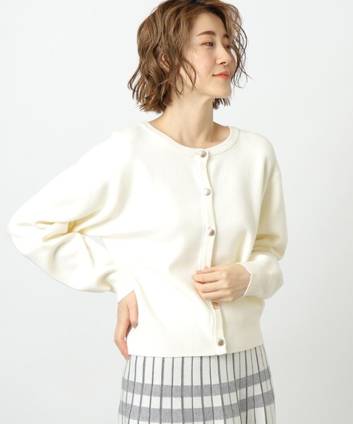 ゴールドボタンが華やか見え!前後2WAYで着回し上手なカーディガン 【デザイン】 前後2WAYで着用できるクルーネックカーディガン。 ダブルジャカード編みでしっかりした厚みがあり、ジャケットライクできれいめな仕上がりです。 ゴールドボタンがクラシカルなアクセントになっています。 【素材】 しっとりとした風合いの糸をダブルジャガードで厚みをもたせて編み上げました。 上品な光沢があり、きれいめな表情です。 【スタイリング】 ゴールドボタンを前に着用する際も、ボタンを締めてプルオーバーライクに着用頂くのがおすすめです。 前後2WAY仕様なので、アクセサリーやボトムを主役にしたい時はボタンを後ろにくるように着用頂く事もできます。 コンパクトな着丈ですので、ボリュームのあるスカートと相性◎ 一部のカラーは768-77013のスカートとセットアップ着用も可能です。 モデル情報:身長166cm B80 W59 H86 着用サイズ:02(M) 店舗へのお問い合わせ商品番号:768-37011 ●製品寸法: 01(S):着丈48cm B93cm 袖丈53cm 肩幅40cm アームホール21cm 02(M):着丈50cm B96cm 袖丈54cm 肩幅41cm アームホール22cm 03(L):着丈52cm B99cm 袖丈55cm 肩幅42cm アームホール23cm 04(LL):着丈54cm B102cm 袖丈56cm 肩幅43cm アームホール24cm 05(3L):着丈56cm B105cm 袖丈57cm 肩幅44cm アームホール25cm 備考: