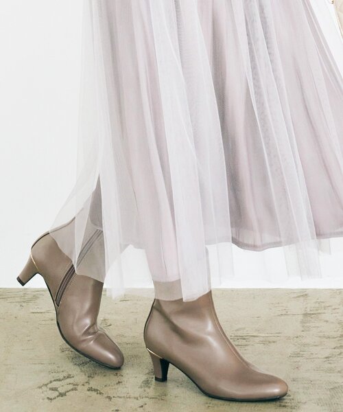ヒールのきらりと光るメタルパーツが上品な印象のショートブーツ。 【デザイン】 すっきりとした優しいアーモンドトゥのデザインショートブーツ。 センターの切り替えをデザインし、すっきりキレイめな印象に仕上げました。 トレンド感のある少し長めの筒丈16.5cmのコーディネイトしやすい丈感と上品な印象の約6cmヒールで大人っぽく使えるショートブーツです。 クッションをしっかりと敷いたインソールに、内側にはジャージ素材を使用して足あたりも優しく、滑りにくいアウトソールを使っているのが嬉しいポイントです。 Sサイズ:22.5cm~23.0cm相当 Mサイズ:23.0cm~23.5cm相当 Lサイズ:24.0cm~24.5cm相当 ※014カラーの裏地のみ、サンプルのため本生産とカラーが異なります。内側はダークブラウンのカラーになります。 店舗へのお問い合わせ商品番号:769-17013 ●製品寸法: 30(23.0cm):ヒール高5.5cm 幅7.7cm ブーツ筒周り23.7cm ブーツ総丈20.6cm 35(23.5cm):ヒール高5.5cm 幅7.9cm ブーツ筒周り24.0cm ブーツ総丈20.9cm 45(24.5cm):ヒール高5.6cm 幅8.3cm ブーツ筒周り24.6cm ブーツ総丈21.5cm 備考:重量:サンプルサイズ45(24.5cm)片足約255g