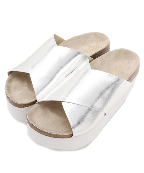 太め幅のクロスストラップと厚底アウトソールでボリュームたっぷりに仕上げたサンダルです。つま先底には少し反りをもたせているので、ストレスのない足さばきを楽しめます。カジュアルながらもモードな存在感を漂わせたルックスが、デイリーの幅広い着こなしにマッチする1足です。