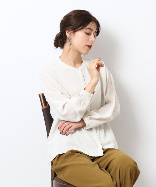 ペプラムシルエットがステキ★シンプルフェミニンなきれいめブラウス、ウエストシェイプでスタイルアップ。【デザイン】タック使いでウエストをほどよくシェイプした女性らしいシルエット。ゴールドボタンが華やかなアクセントになっています。前後差のあるシルエットとタックデザインが、気になるお腹周りもしっかりとカバーしてくれます。【素材】落ち感のある柔らかなブラウス素材。【スタイル】テーパードパンツやフレアスカートと合わせたきれいめオフィススタイルから、デニムと合わせたカジュアルスタイルまで幅広く活躍します。モデル情報:身長164cm B78 W56 H80 着用サイズ:02(M)店舗へのお問い合わせ商品番号:741-87024●製品寸法:02(M):着丈61cm B90cm 袖丈49cm 肩幅46cm03(L):着丈62cm B92cm 袖丈49cm 肩幅47cm04(LL):着丈63cm B94cm 袖丈50cm 肩幅48cm備考: