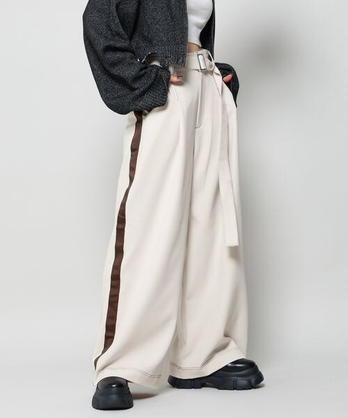 ーーー ハイウエストデザインのワイドパンツ 太目のベルトデザインによってウエスト周りをスッキリと見せ、脚長効果も期待できます。 サイドに入った配色ラインテープが程よいスポーティーテイストをプラス。 裾やウエストに入った配色ステッチもさりげないデザインポイントに。 ショート丈トップスを合わせてモードにスタイリングするのがおススメなアイテムです。 ーーー 〈注意事項〉 ・サンプルにて撮影をしておりますので、実際の商品とは素材や仕様・加工・サイズ等が若干異なる場合がございます。 ・モニター・環境等により実際の商品と色味が多少異なって表示される場合がございます。予めご了承をお願いいたします。 ・撮影環境により、光の当たり具合で色味が違って見える場合があります。あらかじめご了承下さい。