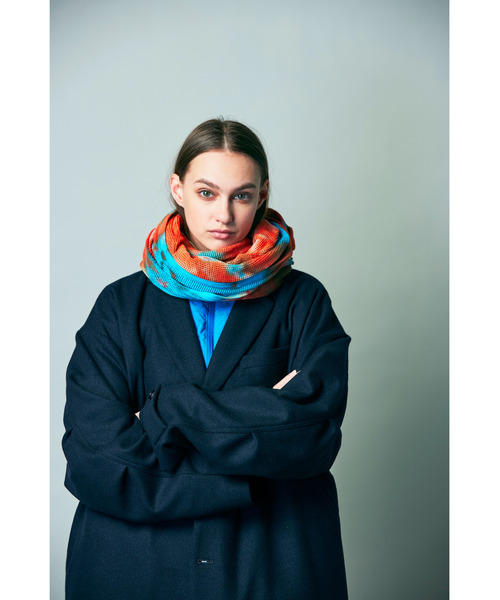 ■タイダイ染めのメッシュストール。砂漠地帯で使用されるメッシュストールをイメージし製作。タイダイ染めを施すことでインパクトのあるデザインとなっています。落綿と呼ばれる糸を製造する工程で削り落とされる綿を再利用した糸を使用。オールシーズン、様々なシーンでお使いいただけるアイテムです。