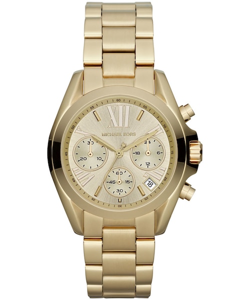 Case size: 35mm. Golden stainless steel. Chronograph movement. Golden dial with tonal time stops and accents. Date window; stopwatch function. Water-resistant up to 10 ATM. 190mm L x 18mm W. Buckle closure. Imported.