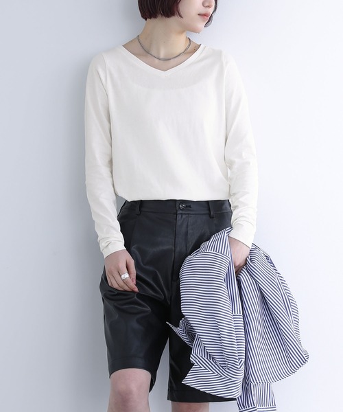 ■デザインレイヤードしても一枚でもサマ見えするように、こだわってデザインしたVネックロングTシャツ。Vネックデザインがデコルテを綺麗に見せ、シンプルなデザインながらも女性らしく映えます。手首でくしゅっとなる長めの袖丈でこなれ感をプラス。ぴたっとしすぎない程良い身幅で、ゆるっとご着用いただけます。ベーシックカラーから差し色まで、ついつい揃えたくなる豊富なカラーバリエーションも魅力的です。すっきり見えするMサイズから一枚でゆるっと着用できるLLサイズまで、選べる3サイズ展開も嬉しいポイント◎■素材さらりと柔らかく、心地良い肌触りのコットン100%生地を使用。程良い厚みで、コーディネート次第でロングシーズン着回していただけます。■コーディネート豊富なカラー展開とシンプルなデザインで、様々なスタイルに合わせていただけます。パンツ・スカートに合わせて一枚で着用するほか、サロペットや羽織りのインナーにも使える、着回しに活躍するアイテムです。==============================【sizeM】着丈:68cm肩幅:34cmアームホール:42cm袖丈:64cm袖口周り:18cmバスト:92cm裾周り:98cm【sizeL】着丈:69cm肩幅:35.5cmアームホール:46cm袖丈:66cm袖口周り:20cmバスト:106cm裾周り:112cm【sizeLL】着丈:70cm肩幅:37cmアームホール:50cm袖丈:67cm袖口周り:22cmバスト:120cm裾周り:126cm==============================