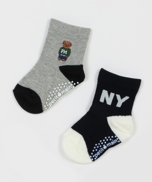 総柄×ワンポイントモチーフデザインを2足組にしたソックスです。 長すぎず短すぎない丈感で、いろいろなスタイリングにマッチします。洗い替えにも便利で、その日の気分で選べるのもうれしいポイント。 サポートゴムで脱げにくく、足裏にはすべり止めプリントがほどこされています。 内側にお名前を記入できるスペースつき。