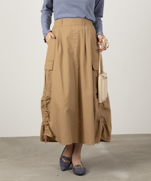 ミリタリーテイストのカーゴロングスカート。両裾のドロストコードで好みのシルエットに変えられます!雰囲気を変えてオリジナルのオシャレを楽しめるアイテムです。カラーは、ブラック・カーキ・ベージュの3色展開です。サイドのカーゴポケットがデザインのアクセント♪綿100%素材を使用しているのも嬉しいポイント!定番のカジュアルスタイルからストリートスタイルまで、幅広いスタイルで活躍してくれます。オールシーズン活躍する、スタイリングの定番としておすすめの一枚です。※ご覧になられているモニター環境や端末により色の見え方に違いがございますので、ご了承ください。■モデルサイズ167cm 53kg B:88/ W:58/ H:85着用サイズ:M※商品画像は、ご覧になられているパソコン、ディスプレイ等の設定により、実際の色味とは異なる場合がございます。