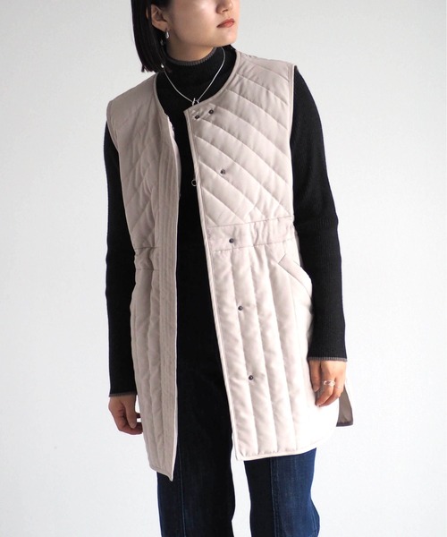 さっと羽織るだけでサマ見えする、キルトハーフベスト♪◇Point◇合わせるアイテムを選ばず旬のコーディネートが楽しめる人気のキルティングデザイン◎ビッグシルエットなトップス、厚手のトップスも重ね着がしやすいゆったりとしたシルエットでありながら、適度にスッキリとした印象を与えてくれるのも魅力です♪◇Material◇季節の変わり目にベストとして、寒くなる頃にはオーバーコートのライナーとしてもお使いただけ、秋から春までシーズン長く重宝します◎裏についているドローコードを絞るとペプラムシルエットになるので女性らしさをプラスできます。◇Coordinate◇ゆったりとした着用感ですがスリットが入っているのでワイドパンツやロングスカート、ワンピースにも合わせやすく、スタイルを選ばず幅広い着回しが可能です♪トレンドのビッグシルエットトップスやメンズライクなパンツと合わせた着こなしには、女性らしい小物を取り入れるだけで、大人カジュアルスタイルに仕上がります。※照明や天候により実際の色味と異なって見える場合がございます。ご了承くださいませ。