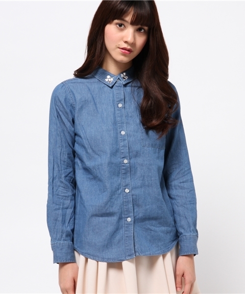 【one after another NICE CLAUP】(ワンアフターアナザーナイスクラップ) non-no7月号掲載 SEDA4月号掲載シンプルなデザインですが、襟のビジューがキラキラポイントになります。 ホワイト、カーキ、デニムとそれぞれ見え方、雰囲気が変わります。これからの季節、羽織としても使えるシャツは大活躍間違いなしです。ショップへお問い合わせの際は下記品番をお伝え下さい。品番:111300040