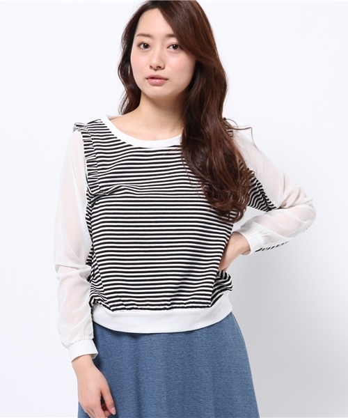 Discoat(ディスコート) 甘くなりがちなフリルもさりげないボリューム感でデイリー使いにおすすめ。肩から袖口までシフォン切替でほっそりしたラインがポイント。コンパクトなデザインでトレンドのフレアスカートにもぴったり。