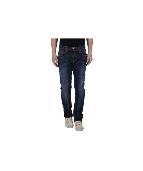 NUDIE JEANS CO Denim pants. denim, solid color, faded effect, mid rise, dark wash, front closure, button, zip, multipockets, contrasting stitching, logo detail, mini studs, straight leg. 99% Organic cotton, 1% Elastane